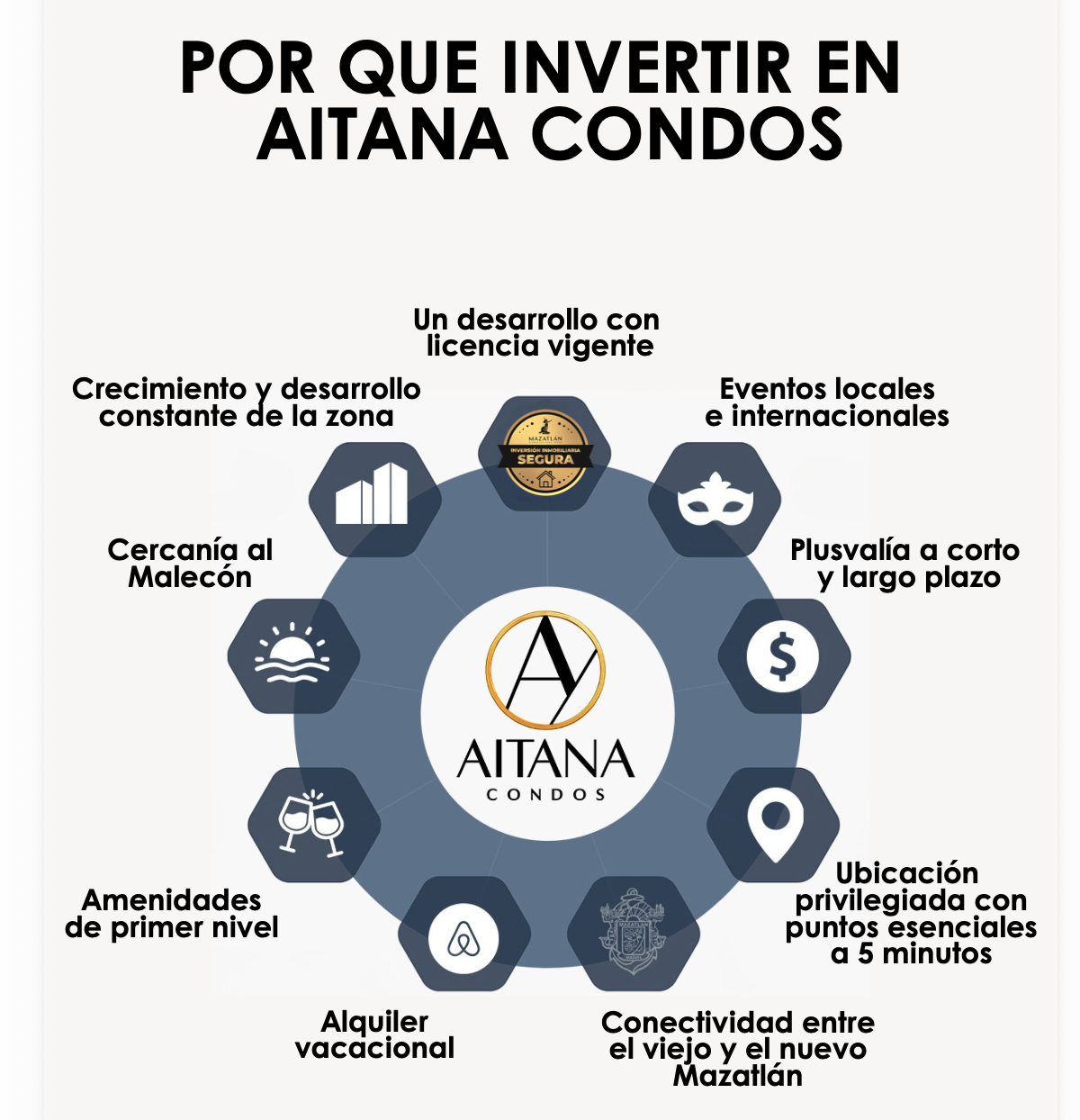 "Situado en un punto clave de Mazatlán, Aitana Condos te ofrece lo mejor de la ciudad a tu alcance. Desde hermosas playas hasta la vibrante vida urbana, todo está solo a unos pasos de distancia."